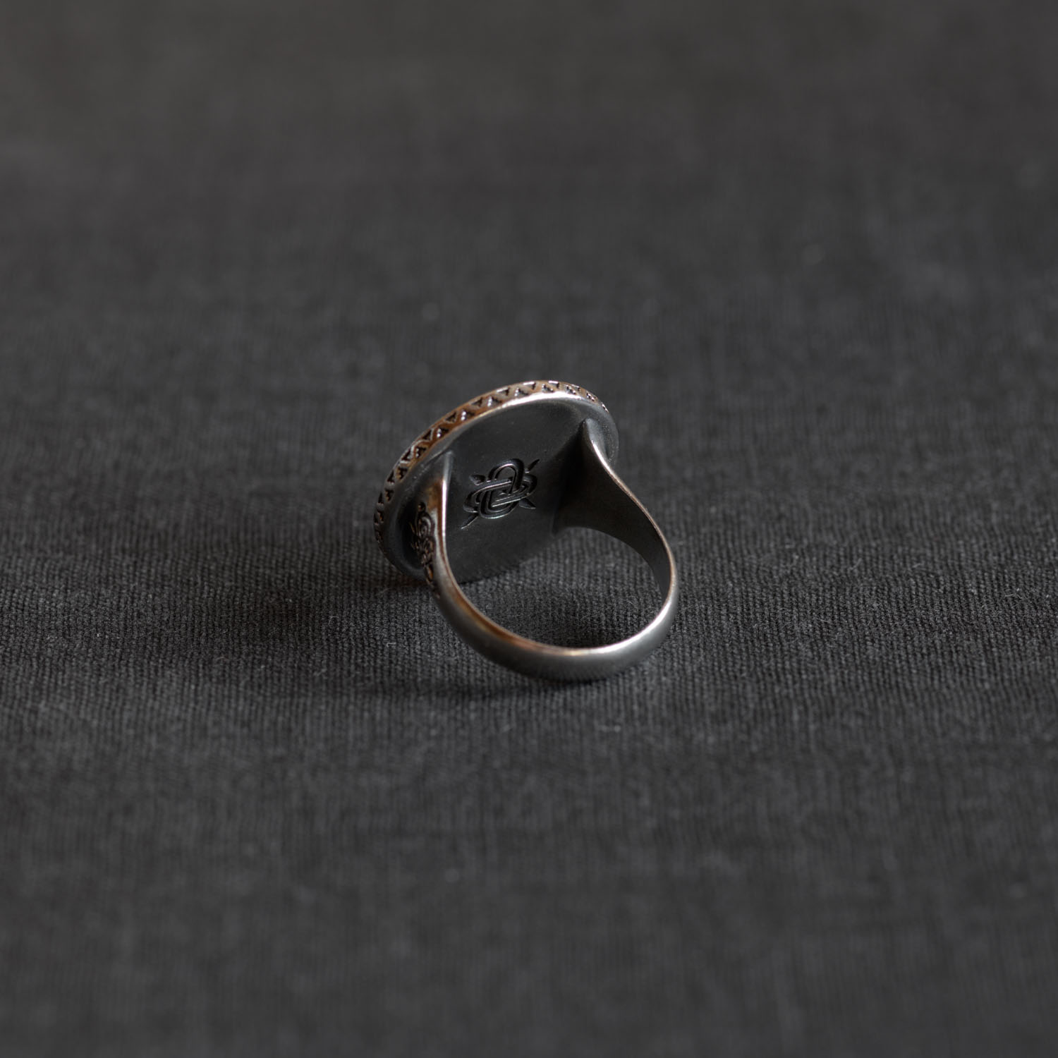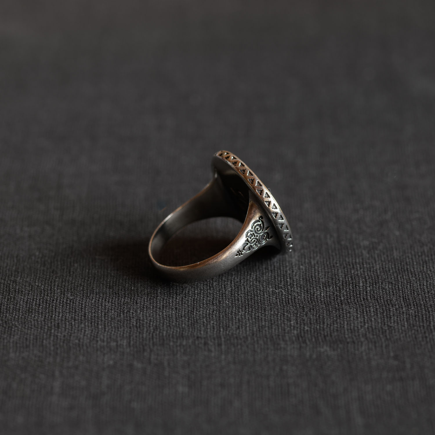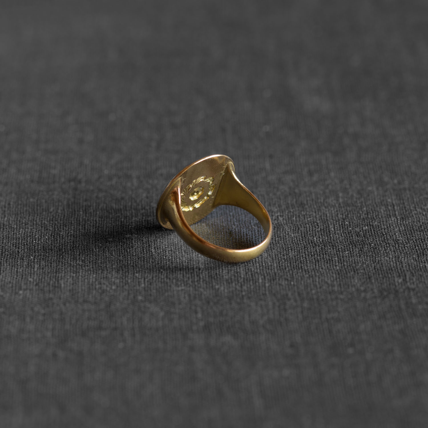 Серебряное кольцо с узким обручем, слегка выпуклым с внешней стороны. Металл зачернён. На площадке кольца установлена круглая фарфоровая камея с профилем Эринии. Эринии (греч. Ἐρινύες) — женские божества возмездия в древнегреческой религии. В формуле клятвы в «Илиаде» они названы «Эриниями, что под землёй мстят людям, давшим ложную клятву».