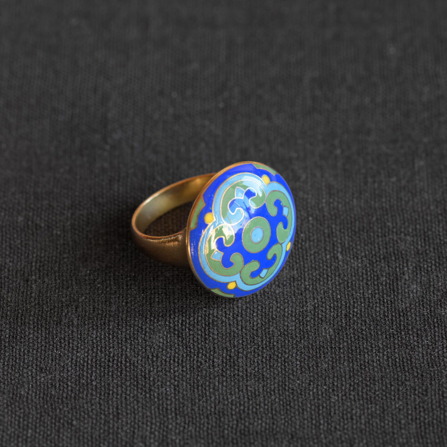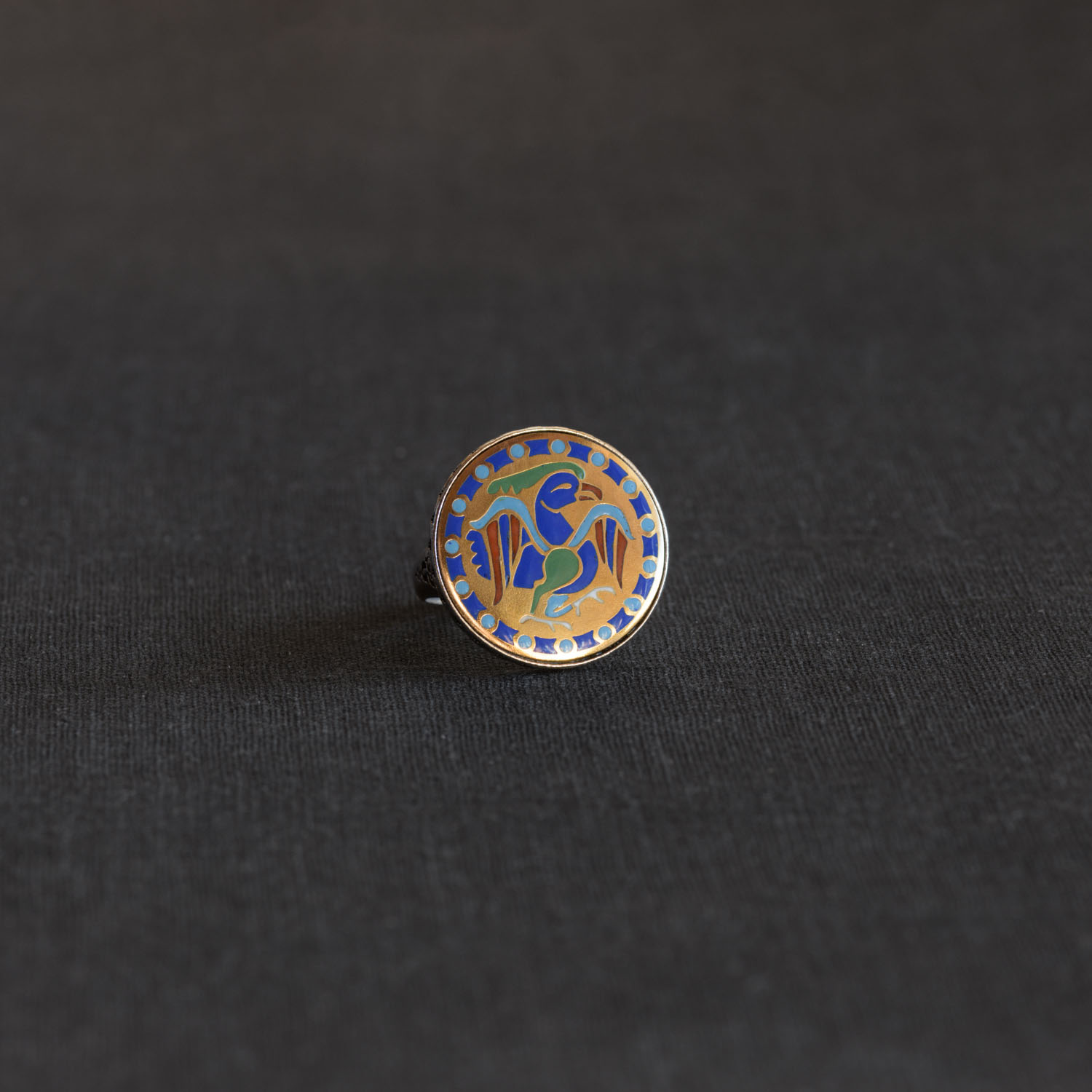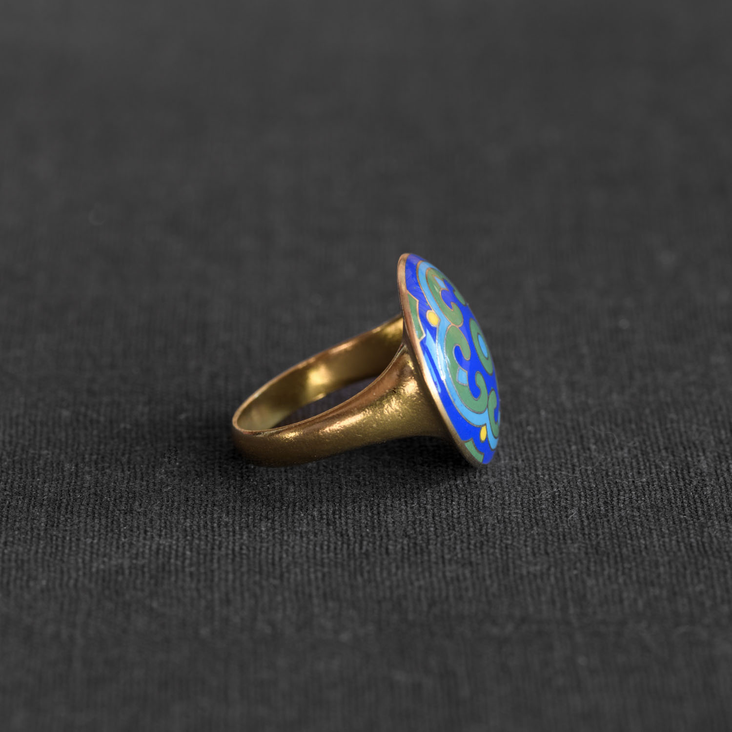 Позолоченное серебряное кольцо с круглой фарфоровой камеей, на которой в профиль изображена спящая Эриния. Площадка с обратной стороны украшена рельефной розеткой. Фарфоровая вставка покрыта кобальтовой глазурью.