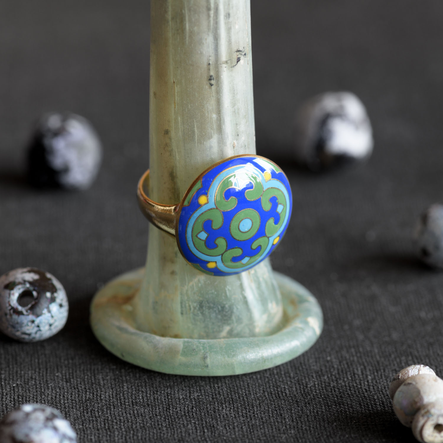 Серебряное кольцо с витым ободом. К площадке кольца прикреплена бочкообразная бусина из желтого непрозрачного стекла. Бусина украшена коричневыми и светлыми полосами, образующими завиток. Персия, VIII–IX вв. н. э. Сверху бусину прикрывает крышечка в форме протомы барана. На бусине имеются следы реставрации. Тыльная сторона площадки кольца декорирована растительным орнаментом.