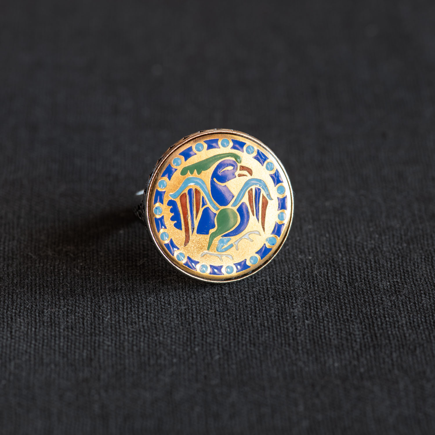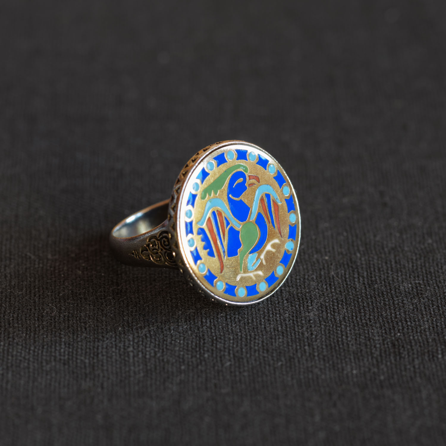Серебряное кольцо с витым обручем D-образной формы и миндалевидной площадкой, украшенной витой каймой и пальметтами. На площадке установлена фарфоровая камея с уткой.