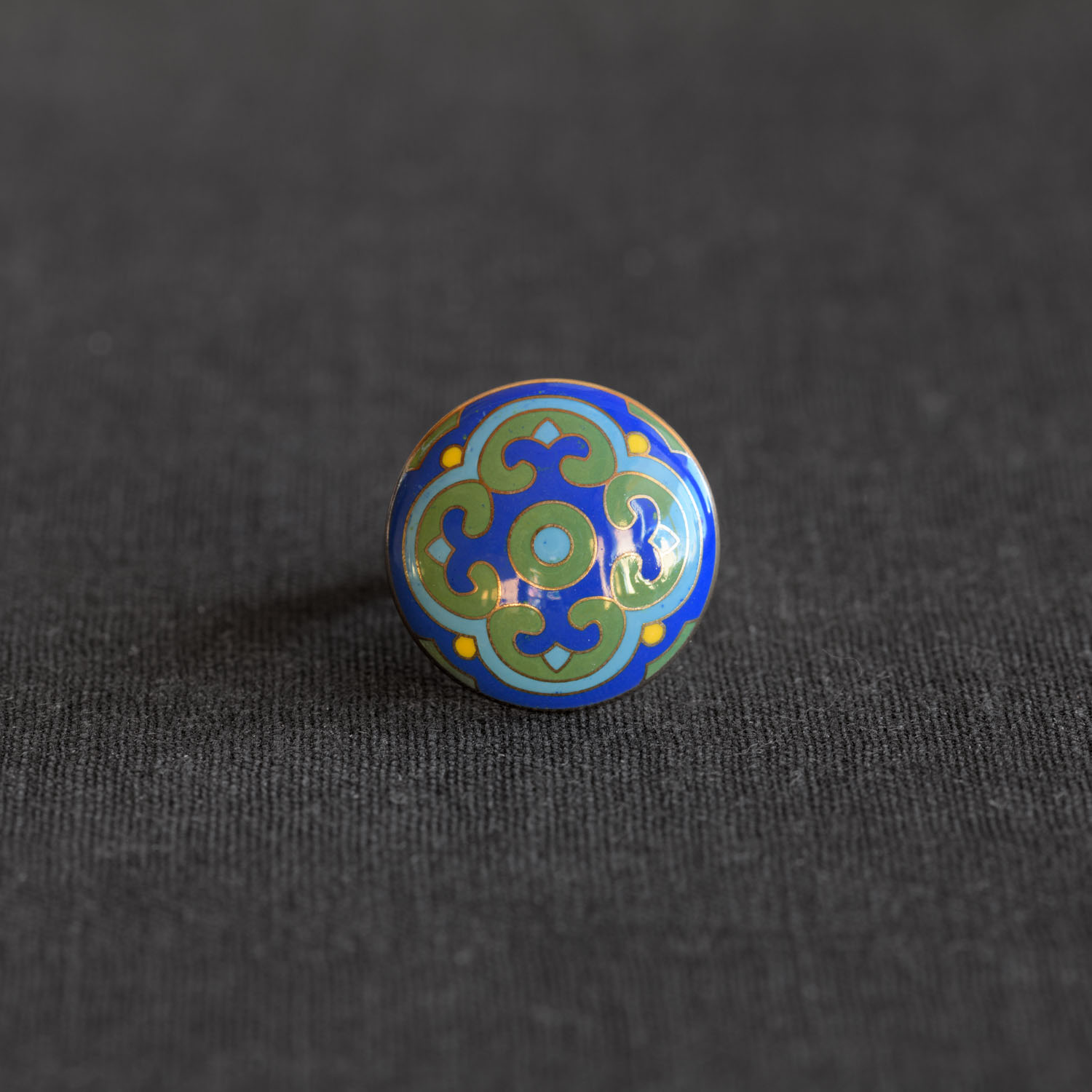 На площадке закреплена овальная бусина из непрозрачного синего стекла с розетками, заполненными крошечными голубыми и белыми глазками. Бусина была сделана в Персии в VIII–IX вв. н. э.
